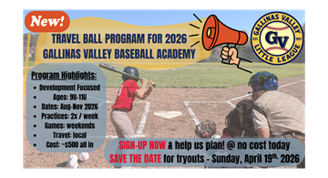 We’re excited to announce plans for a new Travel Ball program launching in Fall 2026 through the Gallinas Valley Baseball Academy.