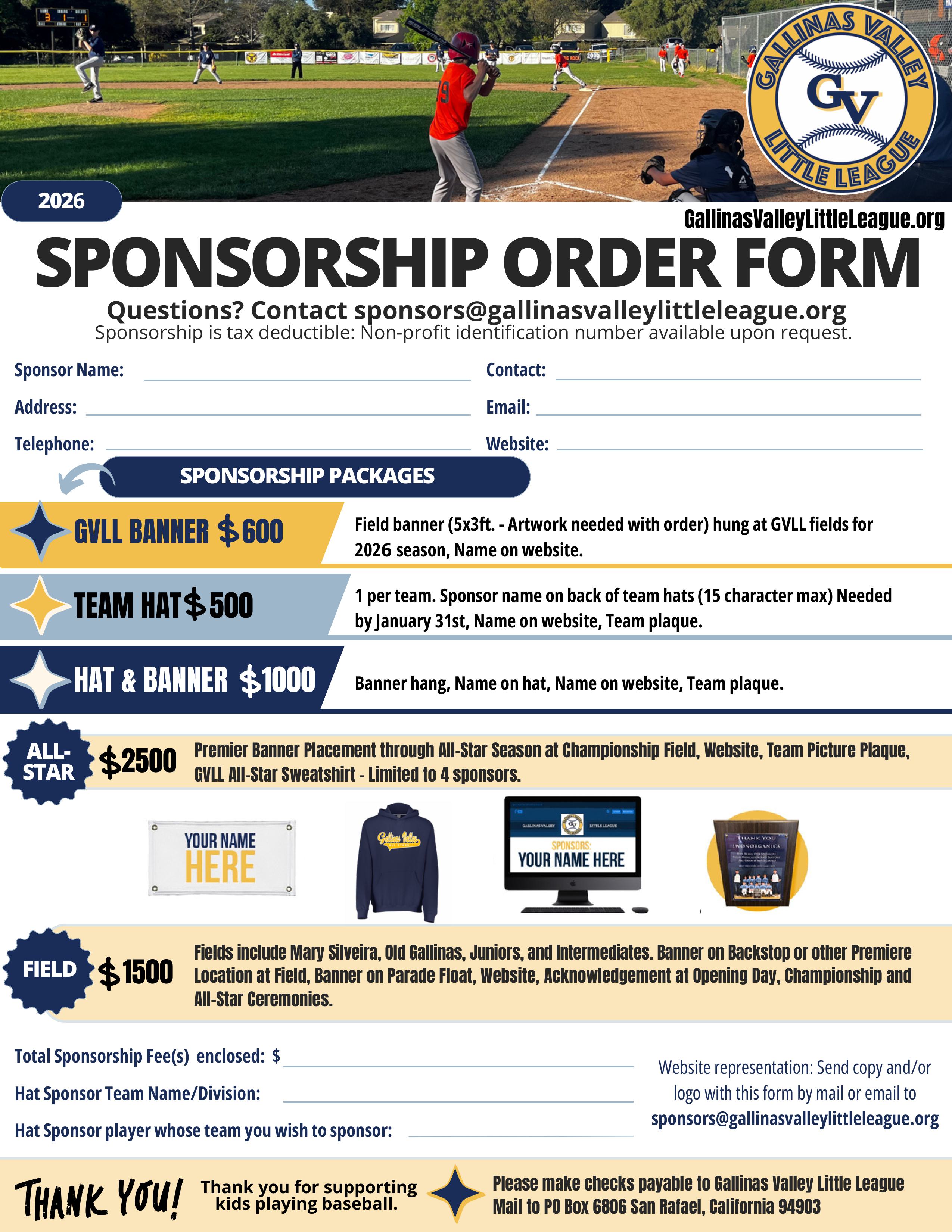 Thank you for considering a sponsorship for Gallinas Valley Little League. Our volunteer non-profit league is grateful for the help we receive from our community. Thank you for supporting kids having fun playing baseball!!